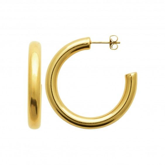 Boucles d'oreilles créoles fil rond de 2 mm de diamètre en plaqué or - 70 mm avec charnière.Bijoux haute fantaisie plaqué or 18 carats 3 microns avec un flash de 24 carats, l'or est 100% recyclé. Placage garanti 10 ans. Collection dessinée par un bureau de design Français créé en 1954.